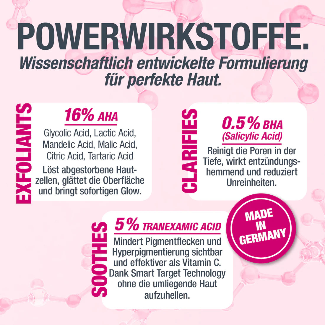 Die hochwirksame Formel mit 16 % AHA, 0,5 % BHA und 5 % Panthenol entfernt sanft abgestorbene Hautschüppchen, verfeinert Poren und sorgt für einen gleichmäßigeren Teint. Gleichzeitig beruhigen pflanzliche Antioxidantien deine Haut und unterstützen die Regeneration.